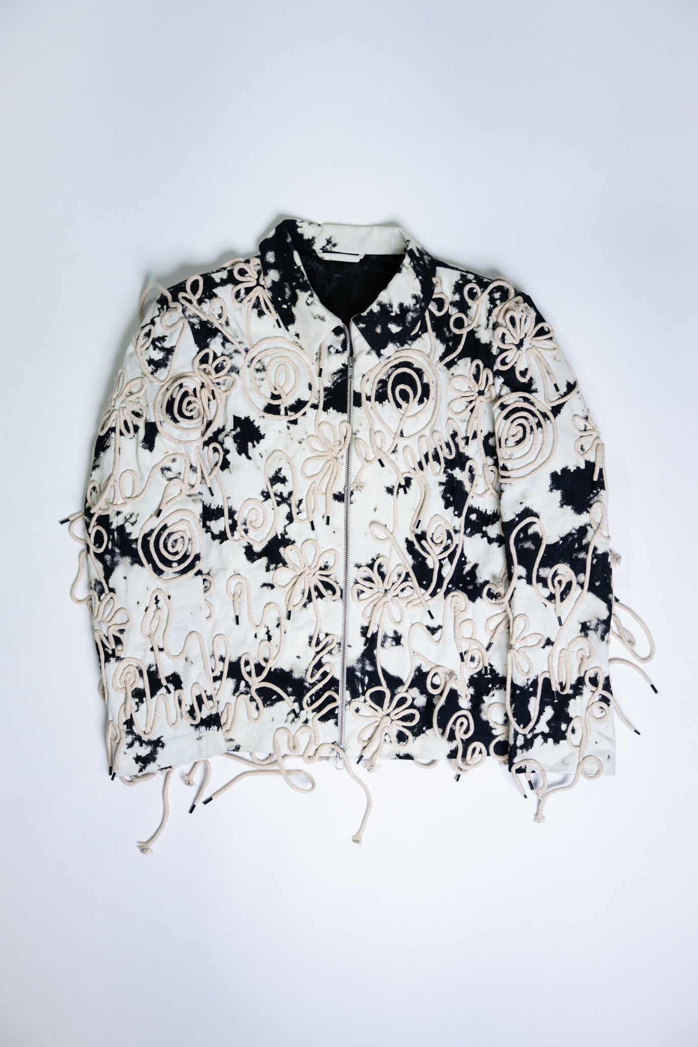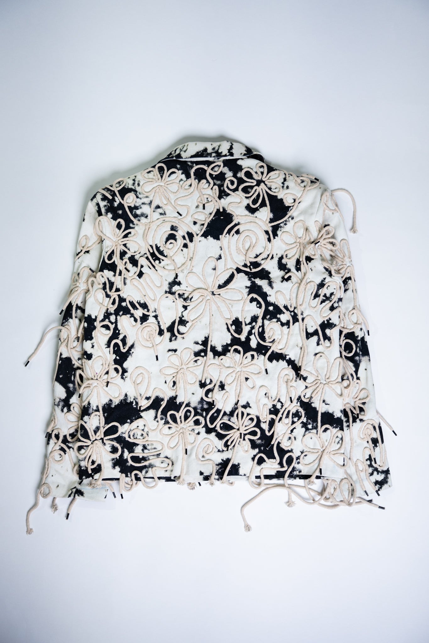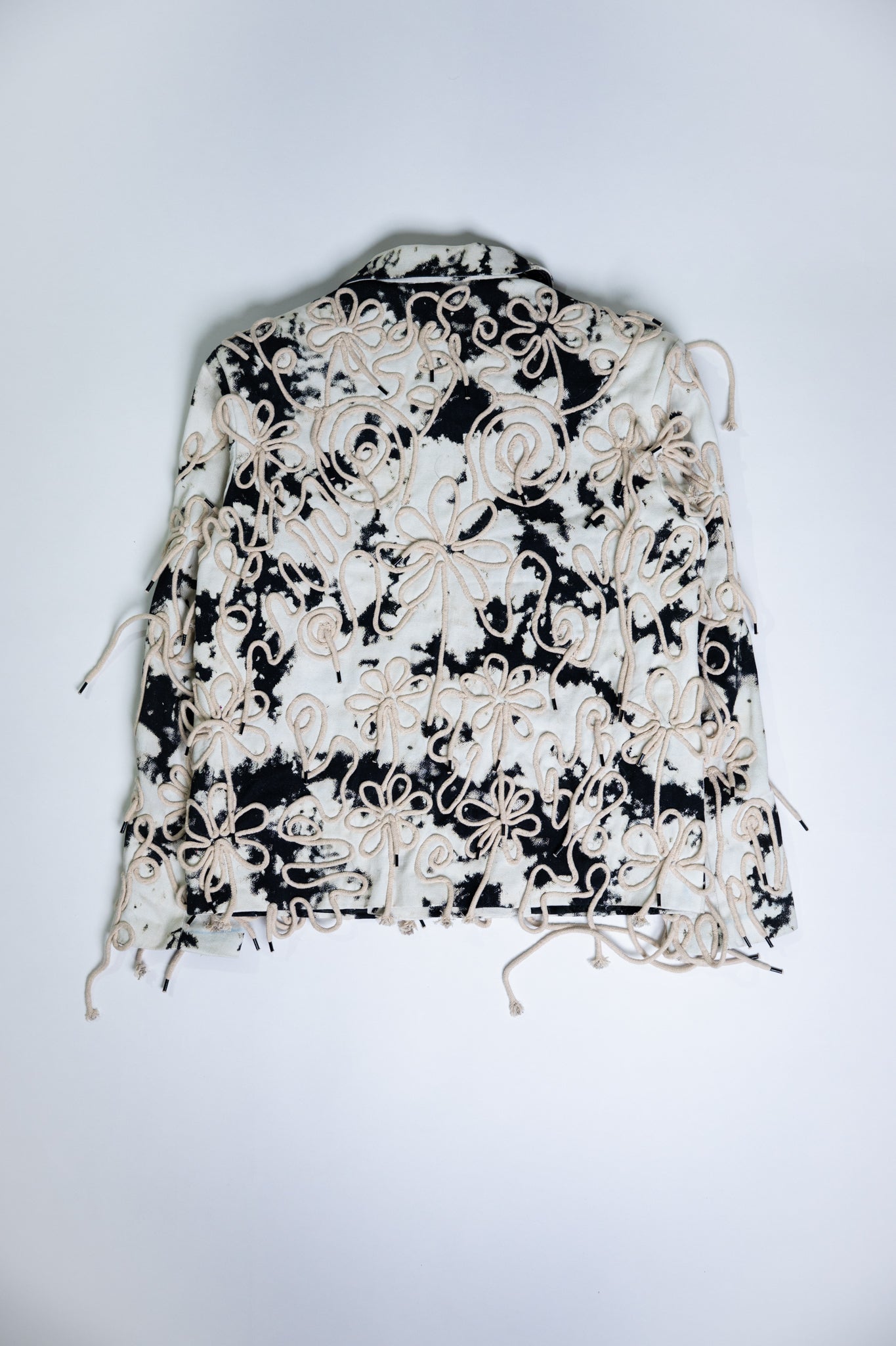 Intricately hand-finished with spiral dori embroidery across the silhouette, the detailing adds depth, texture, and movement—transforming the jacket into a wearable art piece. The sculptural embroidery contrasts beautifully against the printed base, striking a balance between structure and fluidity.